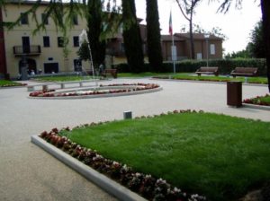 Di fronte all’ingresso principale vi è un altro giardino, contornato da una architettura settecentesca in cotto e chiuso da cancello in ferro.